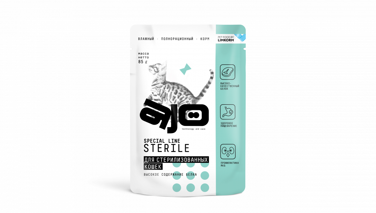 AJO Cat Sterile Высокобелковый влажный корм для активных стерилизованных кошек, кусочки в соусе.