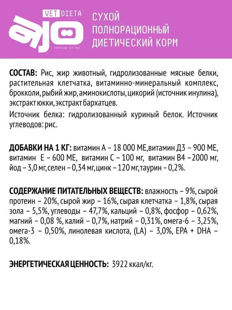 Источник белка: гидролизованный куриный белок. Источник углеводов: рис.