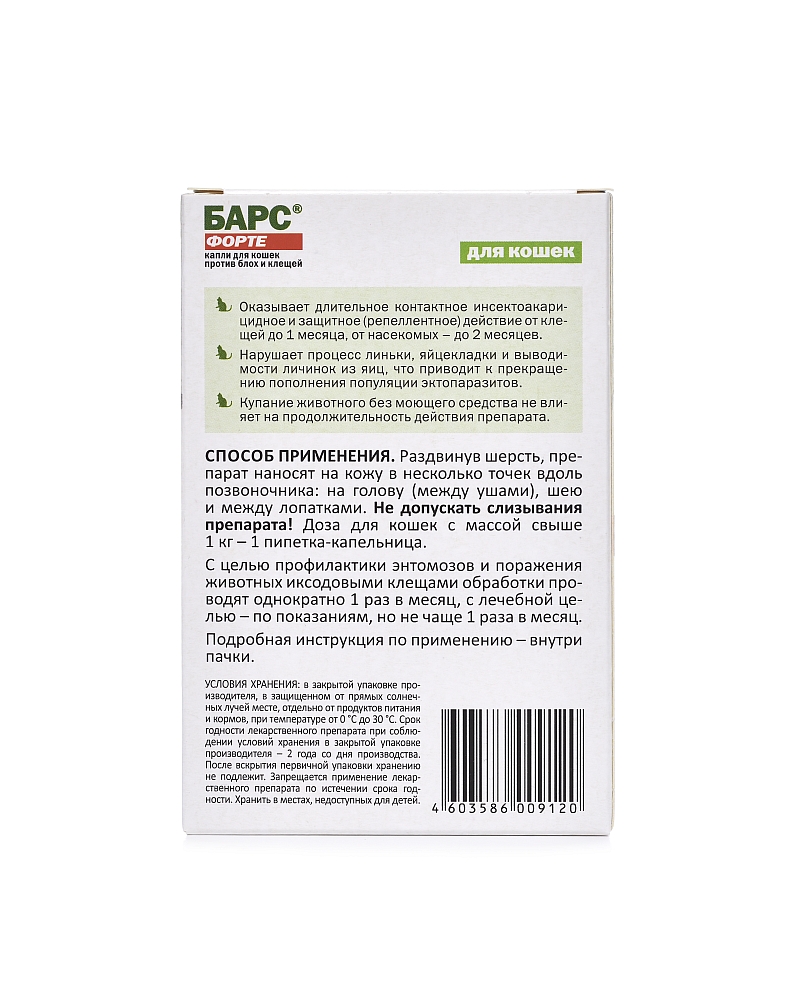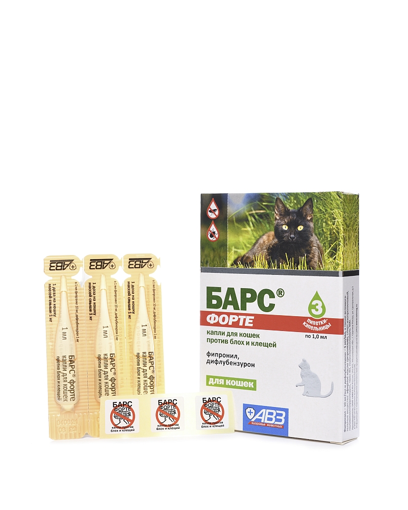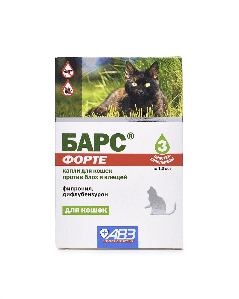 БАРС® форте капли для кошек против блох и клещей назначают кошкам с 8-недельного возраста с лечебной и профилактической целью при энтомозах, вызванных вшами, блохами, власоедами, и нотоэдрозе (чесотка), поражают иксодовыми клещами, а также для предотвращения нападения эктопаразитов на животных.