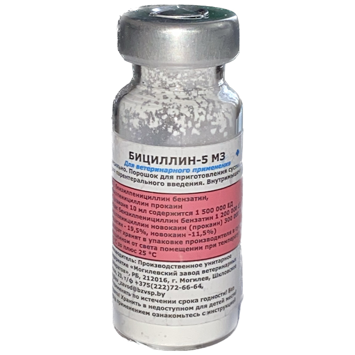 Бициллин-5 МЗ — комплексное антибактериальное средство, содержащее два биосинтетических пенициллина. Препарат активен в отношении грамположительных микроорганизмов, включая Staphylococcus spp., Streptococcus pneumoniae, Corynebacterium diphtheriae, анаэробных спорообразующих палочек, Bacillus anthracis и грамотрицательных микроорганизмов, в том числе Neisseria meningitidis, Actinomyces israelii, а также в отношении Treponema spp. Механизм бактерицидного действия пенициллинов основан на нарушении синтеза пептидогликана (мукопептида), входящего в состав клеточной стенки микроорганизмов, путем ингибирования ферментов транспептидазы и карбоксипептидазы, что приводит к нарушению осмотического баланса и разрушению бактериальной клетки. После внутримышечного введения Бициллин-5 МЗ всасывается в кровь и сохраняется в терапевтической концентрации на протяжении 7 – 10 суток. Выводится из организма главным образом с мочой и частично с фекалиями. Бициллин-5 МЗ по степени воздействия на организм теплокровных животных относится к 3 классу опасности (вещества умеренно опасные).
