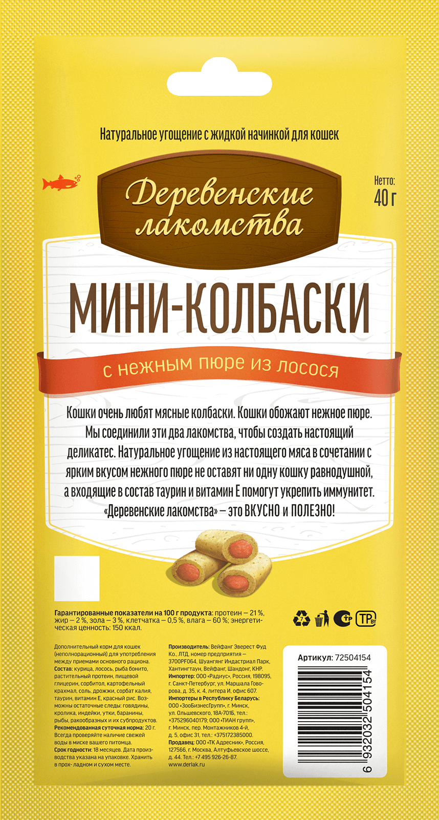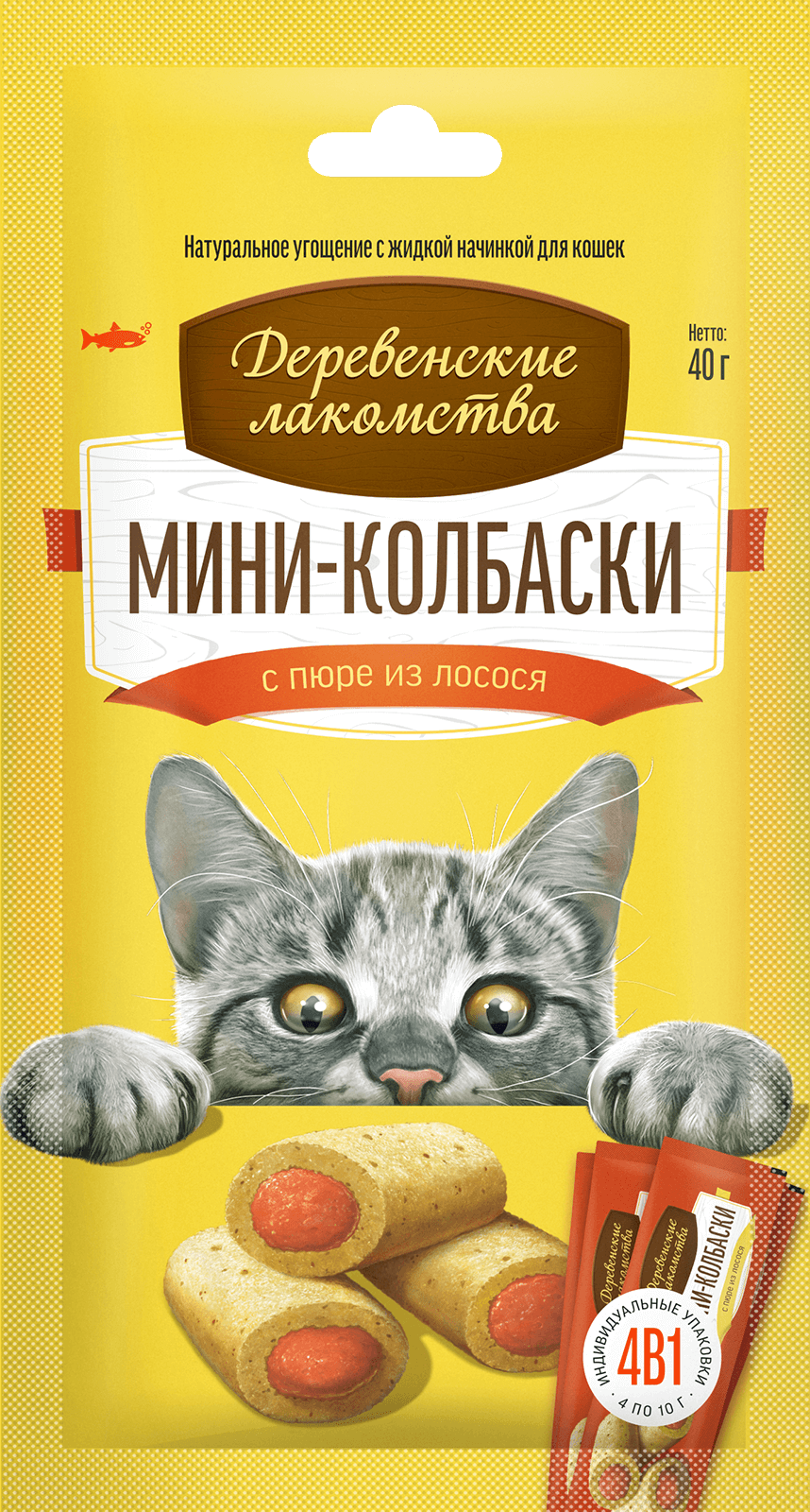 Кошки очень любят мясные колбаски. Кошки обожают нежное пюре. Мы соединили эти два лакомства, чтобы создать настоящий деликатес. Натуральное угощение из настоящего мяса в сочетании с ярким вкусом нежного пюре из лосося не оставят ни одну кошку равнодушной, а входящие в состав таурин и витамин Е помогут укрепить иммунитет.