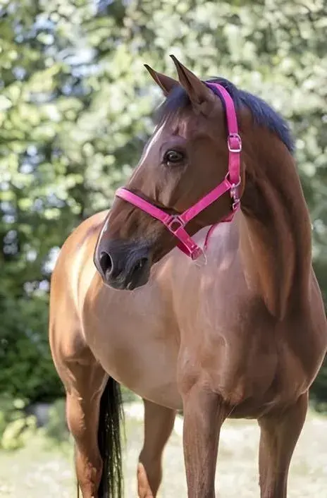 Флуоресцентный недоуздок двойной толщины, мягкий и эластичный. Головная часть с регулируемой пряжкой, и налобный ремень с неопреновой подкладкой. Быстро расстёгивающиеся защелки на шейном ремне. Пряжки из хромированного металла.
