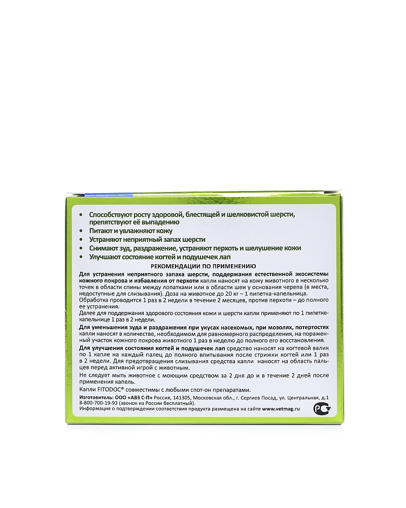 Капли FITODOC® эффективно устраняют неприятный запах шерсти, сохраняя обоняние животного, уменьшают зуд и раздражение кожи. Зоокосметическое действие обусловлено комплексом сбалансированно подобранных эмолентов, способствующих равномерному распределению активных ингредиентов по поверхности кожного покрова и их лучшему проникновению в глубокие слои эпидермиса, не закупоривая при этом поры и не всасываясь в кровь. После нанесения капли FITODOC® восстанавливают структуру и стимулируют обменные процессы в эпидермисе, эффективно увлажняют кожу на поверхности и в глубоких слоях эпидермиса. Восполняют потребность в незаменимых жирных кислотах (омега-3 и омега-6).