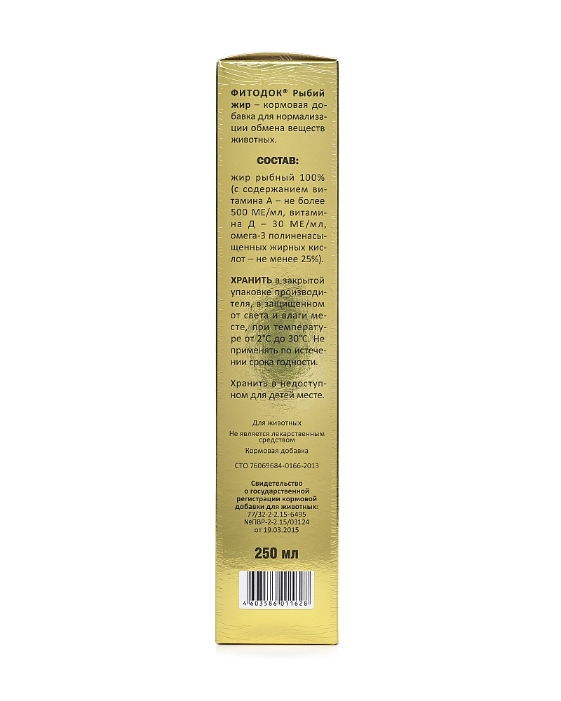 В состав кормовой добавки входит жир рыбный ветеринарный -100% (с содержанием витамина А – не более 500 МЕ/мл, витамина D – не менее 30 МЕ/мл, омега-3 полиненасыщенных жирных кислот – не менее 25%).