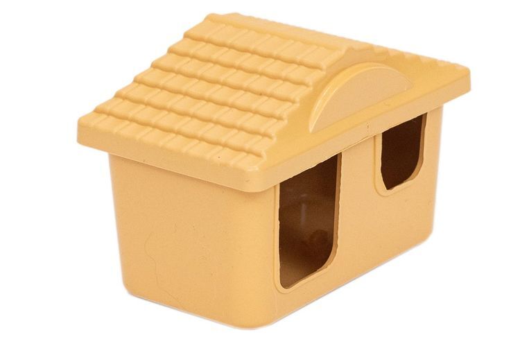 Домик для мелких грызунов. Разборный, состоит из двух частей, в собранном состоянии имеет размеры 11*8*7см. На задней части расположены крепежи в виде крючков.