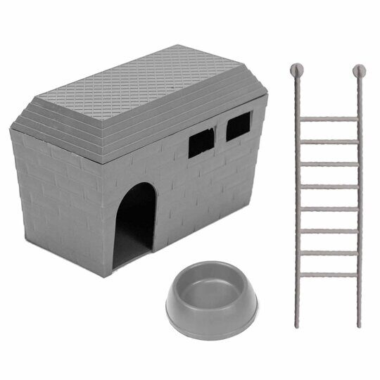 Домик для грызунов состоит из 2-х частей: основание и крыша, укомплектован лесенкой и миской. Из цветного полипропилена.