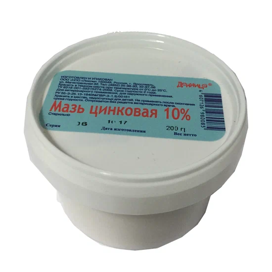 Мазь цинковую 10% применяют животным для лечения заболеваний кожи (дерматитов, поверхностных ран, ожогов, язв, пролежней, фурункулезов, пиодермии).