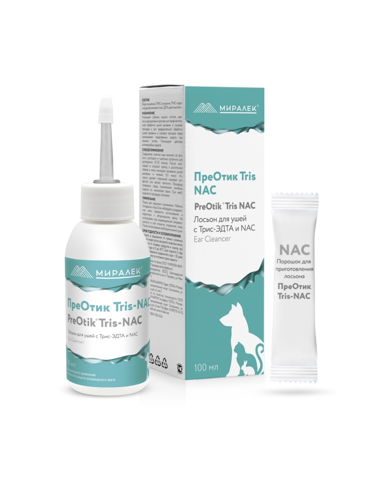 Инновационная формула лосьона эффективно борется с биопленкой и помогает в лечении микробных отитов. Трис-ЭДТА обладает антибактериальным действием и помогает предотвратить образование новой биопленки, в то время как N-ацетилцистеин разрушает существующую биопленку. Оба компонента показали безопасность при введении в среднее ухо у собак.