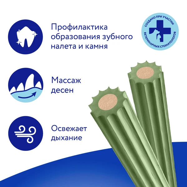 Мнямс ДЕНТАЛ "Зубные палочки" с хлорофиллом – вкусное и полезное лакомство для взрослых собак и щенков старше 3-х месяцев. Обладают высокой вкусовой привлекательностью, предотвращают появление зубного налета, обеспечивают деликатный массаж десен. Благодаря хлорофиллу в составе, способствуют снижению кровоточивости десен, дезодорирует полость рта и освежают дыхание.