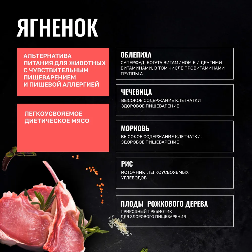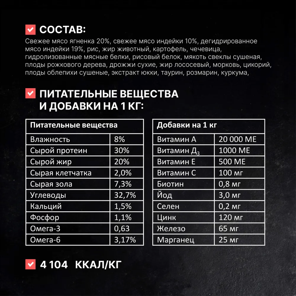 свежее мясо ягненка 20%, свежее мясо индейки 10%, дегидрированное мясо индейки 19%, рис, жир животный, картофель, чечевица, гидролизованные мясные белки, рисовый белок, мякоть свеклы сушеная, плоды рожкового дерева, дрожжи сухие, жир лососевый, морковь, цикорий, плоды облепихи сушеные, экстракт юкки, таурин, розмарин, куркума, глюкозамина сульфат – 800 мг/кг, хондроитина сульфат – 200 мг/кг.