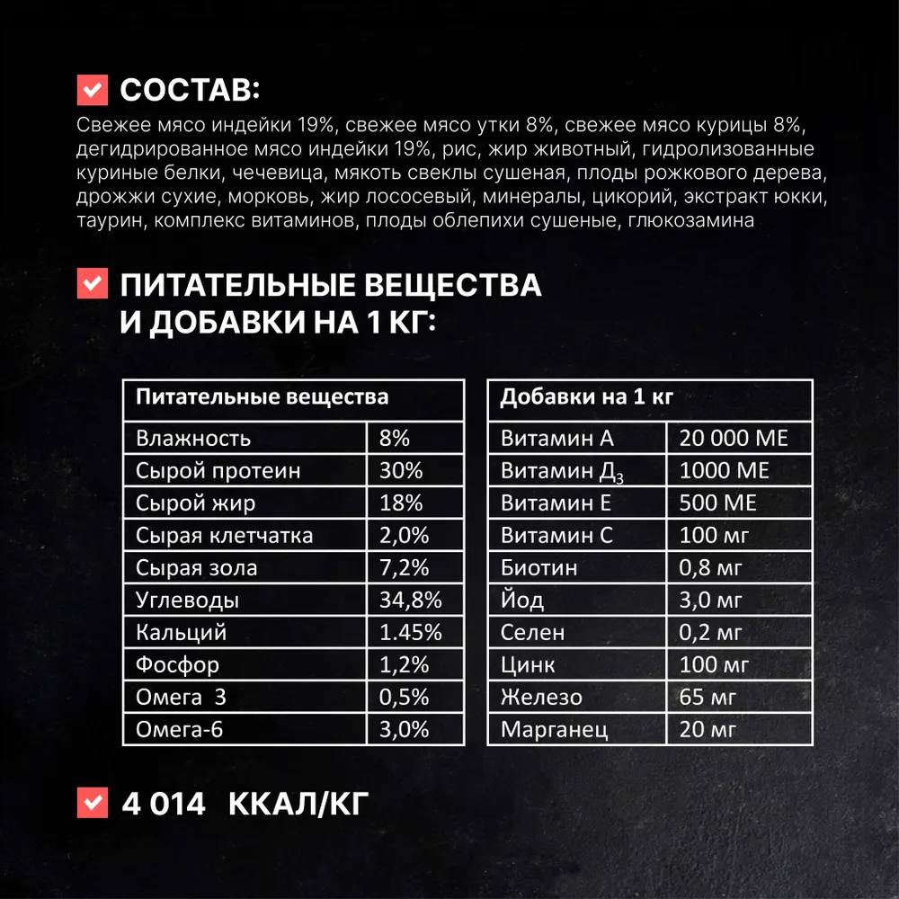 свежее мясо индейки 19%, свежее мясо утки 8%, свежее мясо курицы 8%, дегидрированное мясо индейки 19%, рис, жир животный, гидролизованные куриные белки, чечевица, мякоть свеклы сушеная, плоды рожкового дерева, дрожжи сухие, морковь, жир лососевый, минералы, цикорий, экстракт юкки, таурин, комплекс витаминов, плоды облепихи сушеные, глюкозамина сульфат – 800 мг/кг, куркума, розмарин, хондроитина сульфат – 200 мг/кг.