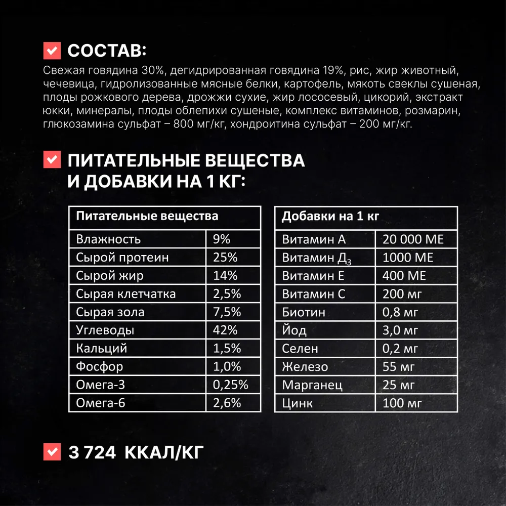 свежая говядина 30%, дегидрированная говядина 19%, рис, жир животный, чечевица, гидролизованные мясные белки, картофель, мякоть свеклы сушеная, плоды рожкового дерева, дрожжи сухие, жир лососевый, цикорий, экстракт юкки, минералы, плоды облепихи сушеные, комплекс витаминов, розмарин, глюкозамина сульфат – 800 мг/кг, хондроитина сульфат – 200 мг/кг.