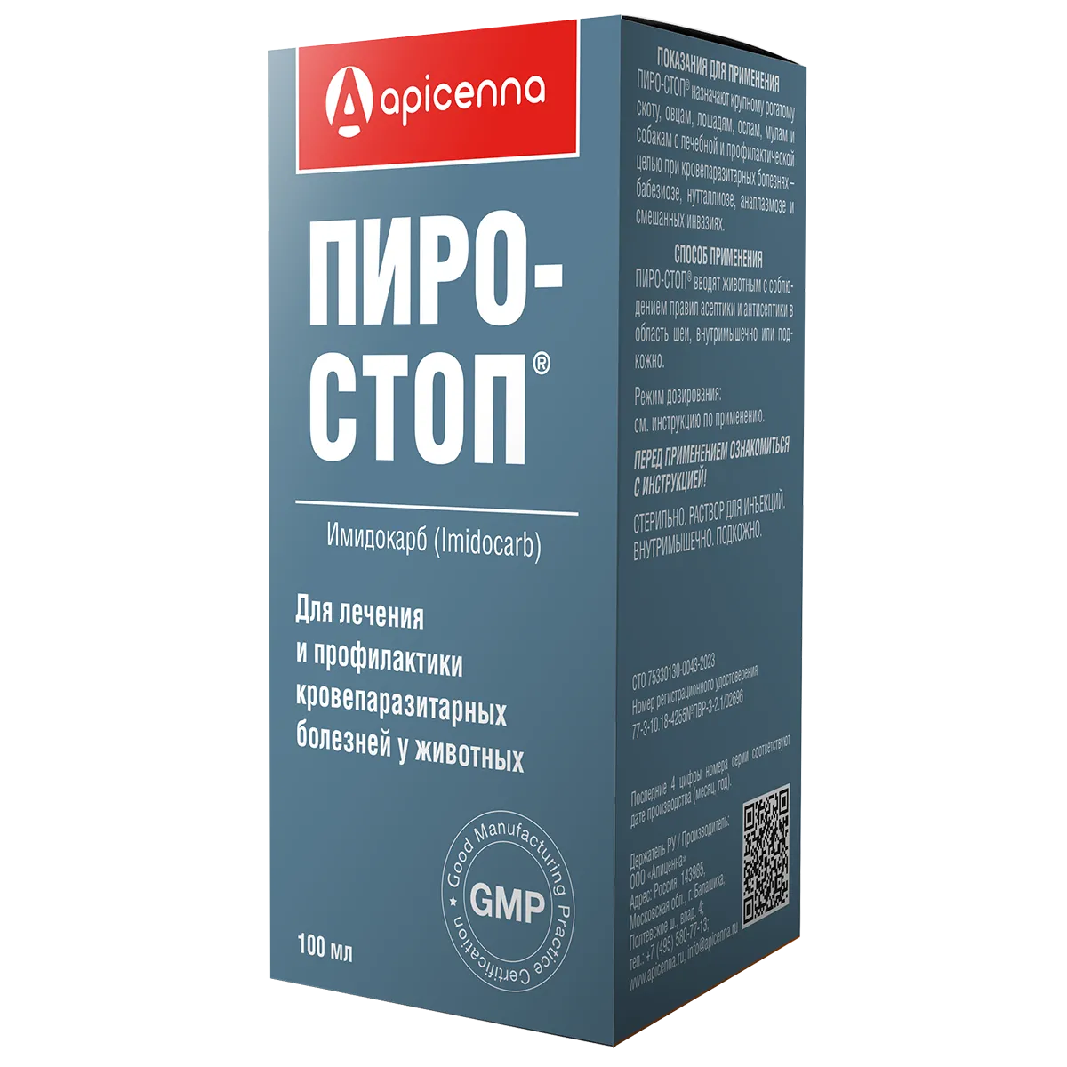 Пиро-Стоп — противопротозойный инъекционный препарат, содержащий в 1 мл раствора в качестве действующего вещества 120 мг имидокарба дипропионата, а также вспомогательные компоненты: 10 мг поливинилпирролидона, 9 мг бензилового спирта, 30 мг пропионовой кислоты и воду для инъекций.