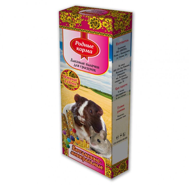 Лакомые палочки «Родные корма» с витаминами и минералами для всех видов грызунов являются отличным и вкусным дополнением к ежедневному корму Вашего питомца. Лакомство изготовлено из натуральных компонентов скрепленных яичной основой. Благодаря входящему в состав витаминно-минеральному комплексу повышается сопротивляемость болезням, нормализуется обмен веществ и укрепляется здоровье.