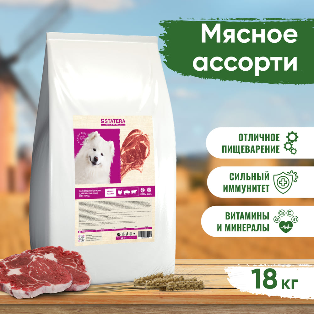 Мясное ассорти STATERA - это сочный микс из трех видов вкуснейшего мяса и самых полезных даров природы! Индейка, свинина и говядина отвечают за развитие и энергию, а натуральная морковь, яблоко и цукини дарят собаке порцию витаминов для блестящего здоровья. Приятного аппетита вашему питомцу!