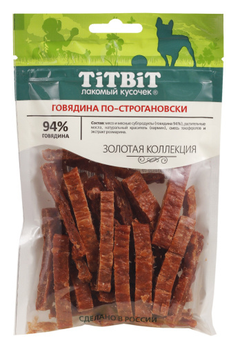 Золотая коллекция – это линейка лучших лакомств TITBIT, разработанных при участии владельцев домашних животных и их питомцев. Говядина по-строгановски - это мясной деликатес, который, благодаря высокому содержанию мяса (94 %) и бережной технологии приготовления, имеет привлекательный внешний вид, невероятный вкус и нежную текстуру. Говядина, входящая в основу лакомства, обогащает организм высококачественным животным белком и аминокислотами. Ни один гурман не сможет устоять перед таким деликатесом.