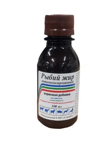 Рыбий жир витаминизированный – добавка кормовая для нормализации обмена веществ у животных, в том числе птиц. По внешнему виду представляет собой маслянистую жидкость, от светло-желтого до светло-коричневого цвета.