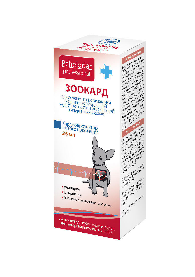 Зоокард (Zookard) суспензия для собак мелких пород – лекарственный препарат, содержащий в 1 мл/5 кг действующие вещества: L-карнитин – 40 мг, экстракт пчелиного маточного молочка – 1 мг, рамиприл – 0,6 мг и вспомогательные компоненты.
